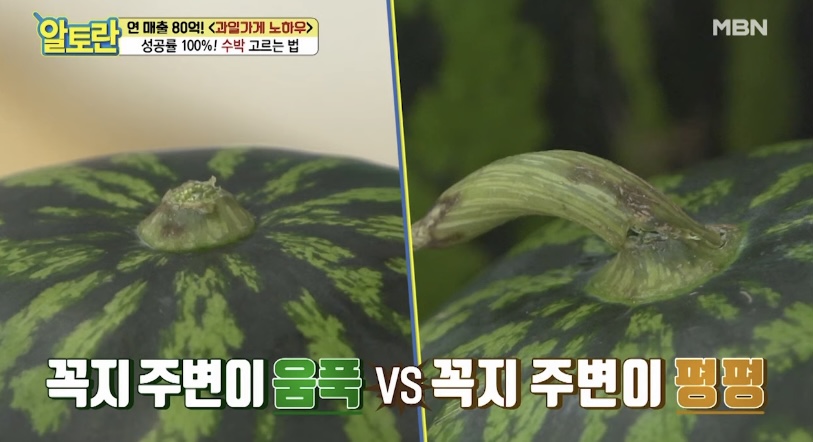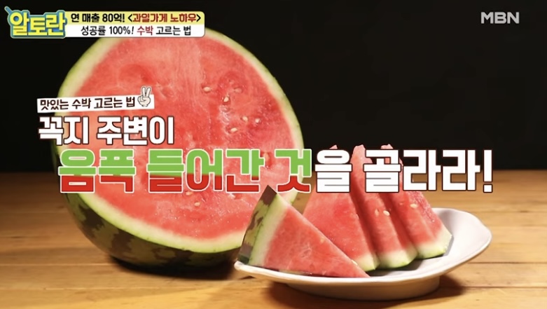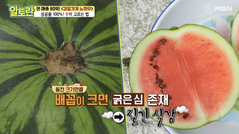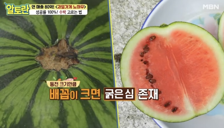 배꼽이 큰 수박은 안의 심지가 큰 수박으로 질긴 부분이 더 많아지고 맛도 덜 할 가능성이 큽니다.