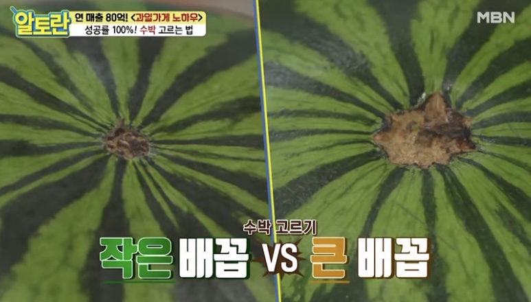 배꼽이 크면 껍질이 두껍고, 수박 심이 생겨 맛이 없다고 합니다.