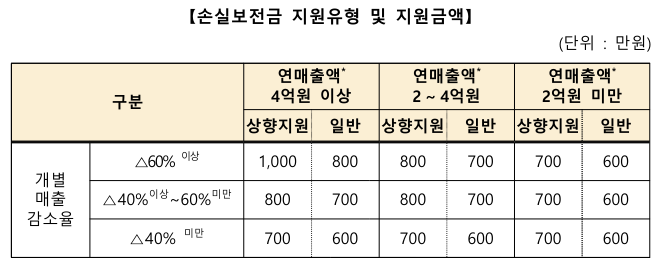 - 개별업체 매출규모 및 매출감소율에 따라 총 9개 구간으로 구분 하여 700만원,800만원 또는 1,000만원 지급(일반 대비 지원금 상향)