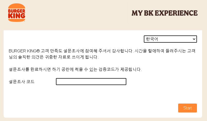버거킹에서 제공하는 고객 만족도 설문조사 입니다. 설문조사 코드를 넣고 시작하시면 바로 진행가능합니다.