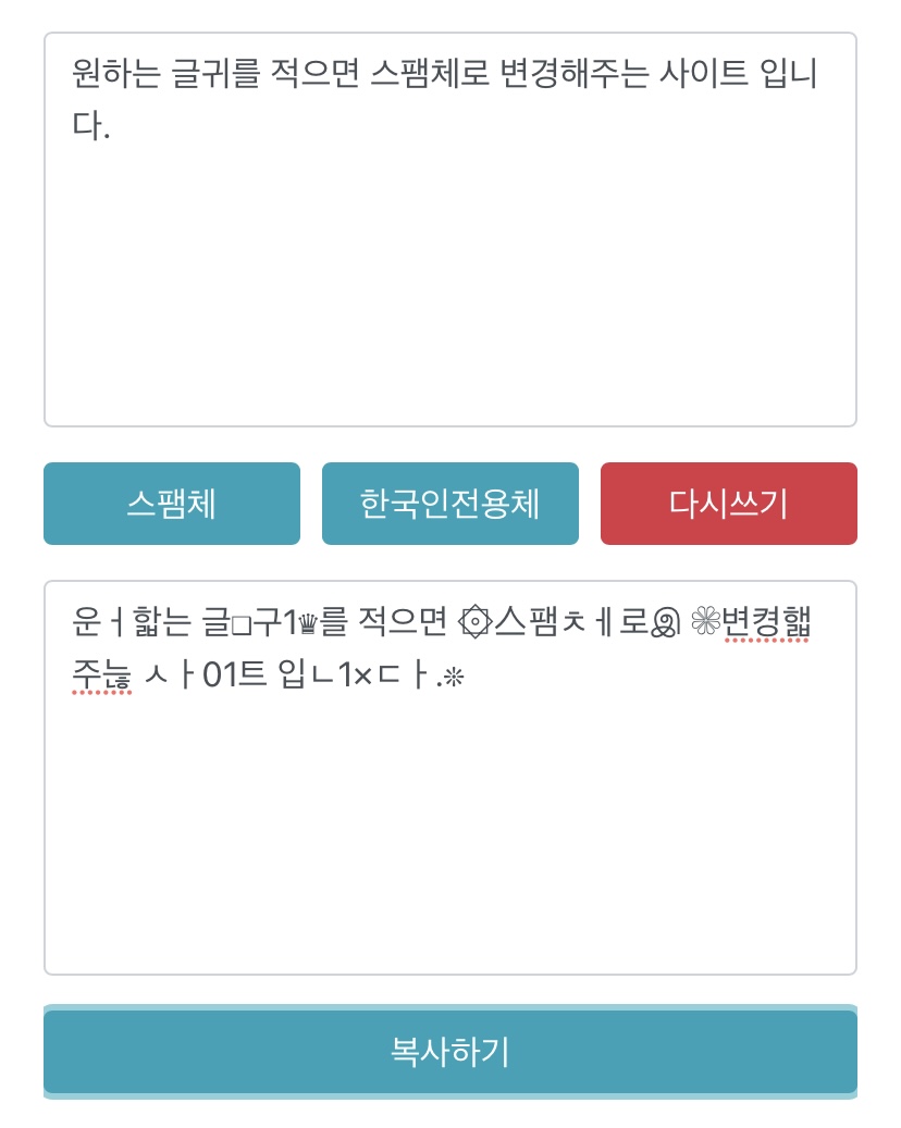 원하는 글귀를 적으면 스팸체로 변경해주는 사이트 입니다. 바로 아래 처럼요!!