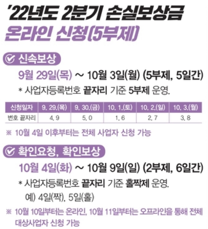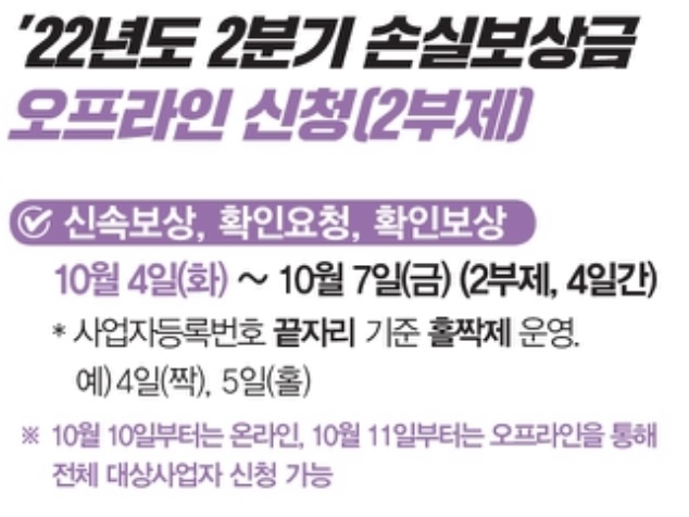 2022년 10월 4일부터 2022년도 2분기 소상공인 손실보상금의 신속 보상 오프라인 신청 및 확인 보상 온라인과 오프라인 신청을 시작 합니다.