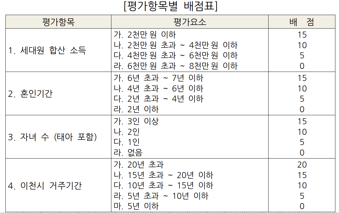 1. 4가지 평가항목(① 세대원 합산 소득 / ② 혼인기간 / ③ 자녀 수 / ④ 이천시 거주기간)2. 평가항목별 배점을 합산한 순위에 따라 지원 대상자를 선정하고, 합산 점수가 같을 경우 각 평가항목의 순서대로 우선순위 선정