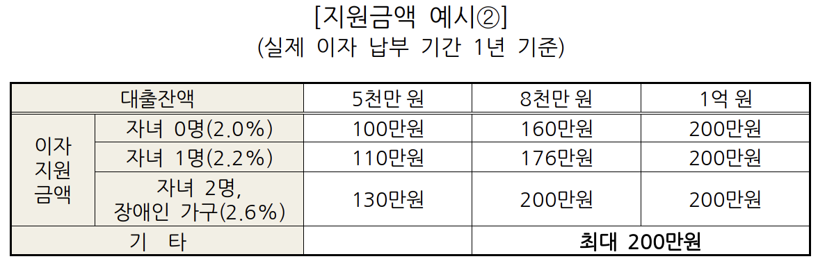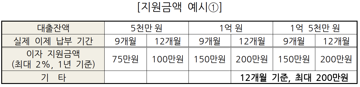 1. 지원금액: 금융권에서 대출받은 주택전월세자금 중 실제 상환한 이자를 지원, 대출잔액의 2%를 연간 최대 2백만 원까지 지원(천원 미만 절사