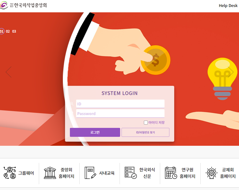 한국외식업중앙회 홈페이지에서는 그룹외어, 사내교육, 한국외식 신문 등을 제공합니다. 시스템 로그인을 통하여 보다 구체적인 서비스 이용해보시면 될 것 같습니다.