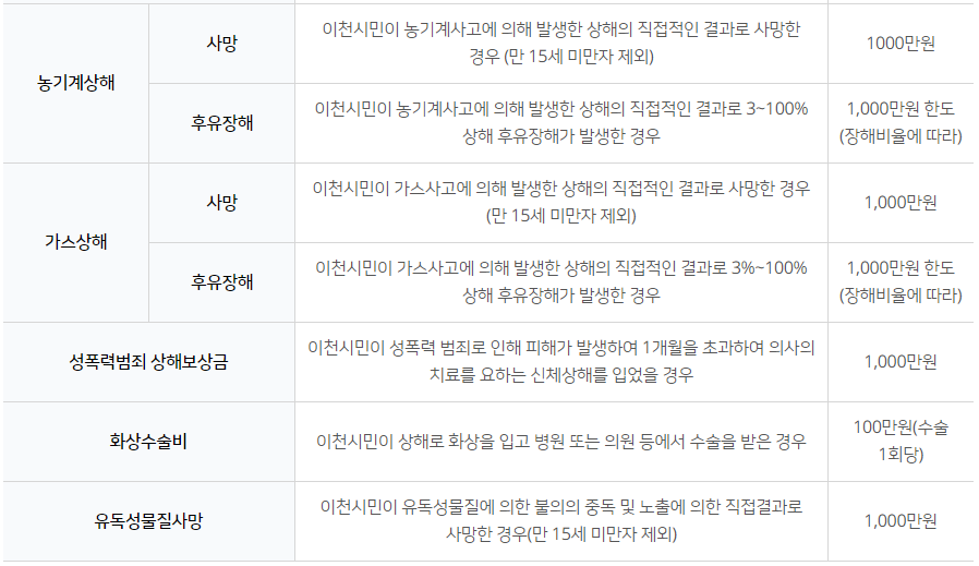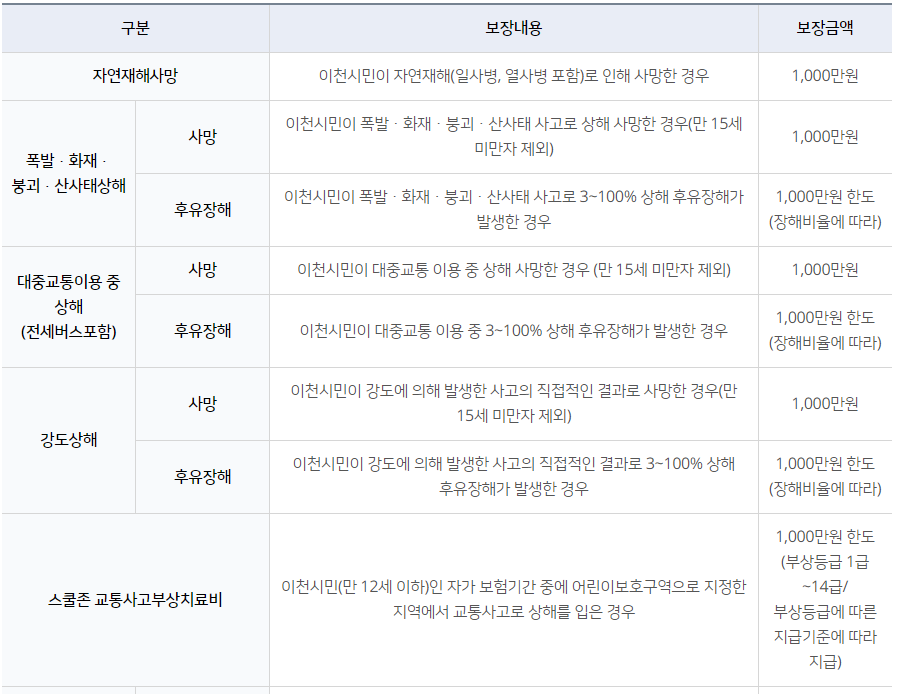 시민안전보험이란이천시민이 일상생활 중 예상치 못한 각종 재난 및 사고로 사망·장해 등 피해를 입는 경우 보험금을 지급받을 수 있는 제도입니다.