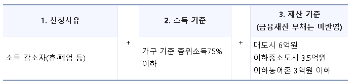 ○ 기초생활보장(생계급여) 수급자는 신청이 불가하며, 별도가구 보장 대상자의 경우 수급자를 제외한 다른 가구원 중 근로사업소득 감소자가 있는 경우 신청 가능합니다.