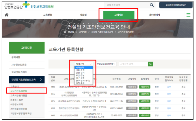 건설업 기초안전보건교육 이수증 발급을 위해서는 우선 교육기관을 먼저 조회해야 합니다. 조회는 아래의 안전보건교육포털에 접속 후 아래 순서대로 신청하여 교육기관에 방문하시면 됩니다.