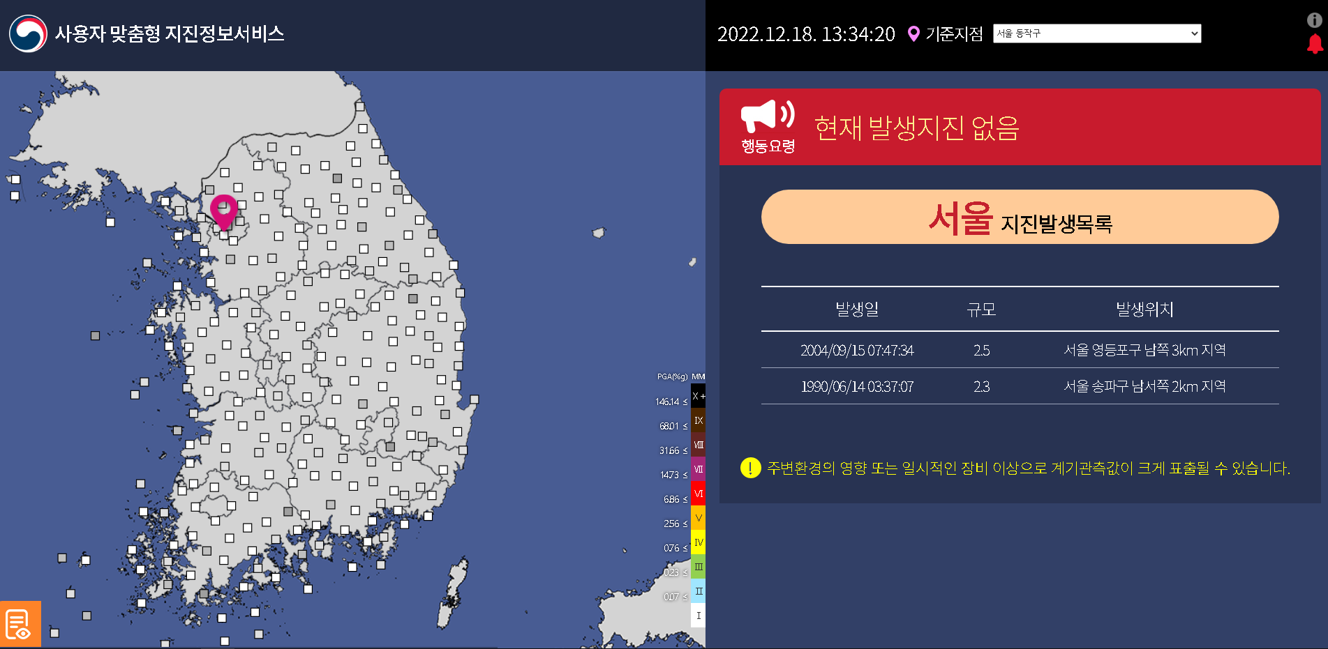 실시간 지진 발생 지역 조회는 기상청 홈페이지 > 실시간 지진감시 탭에 보시면 위 사진과 같이 확인이 가능합니다.