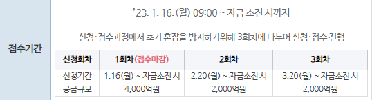 - 신청 1회차는 대표자 주민등록번호 상 출생연도 끝자리 기준으로 31일까지 홀짝제를 시행, 신청시간은 홀짝제 기간 중에는 매일 오전 9시부터 자정까지이고, 홀짝제 종료 후에는 출생연도 상관없이 오전9시부터 24시간 신청 가능