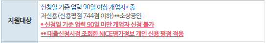 - 업력 90일 이상 업체 중 대표자 개인신용평점 744점 이하(구 6등급 이하, 나이스평가정보 기준)인 소상공인