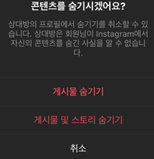숨기기를 눌렀을 때 게시물만 숨길 것인지 아니면 인스타 스토리까지 숨길 것인지 선택하면 됩니다. 인스타 게시물만 숨기기를 한다면 홈탭에서 보이지않고, 스토리는 나오더라도 내가 보지 않으면 되는 부분입니다.