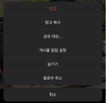 2. 점세개 버튼을 누르면 '신고', '링크복사' 등과 같은 메뉴가 나옵니다. 여기서 우리가 원하는 '숨기기'를 눌러서 선택합니다. 이렇게 숨기기 버튼을 누르셨다면 끝났네요. 이제 여러분이 숨기기한 게시물은 더 이상 여러분의 인스타에 노출되지 않을 겁니다.