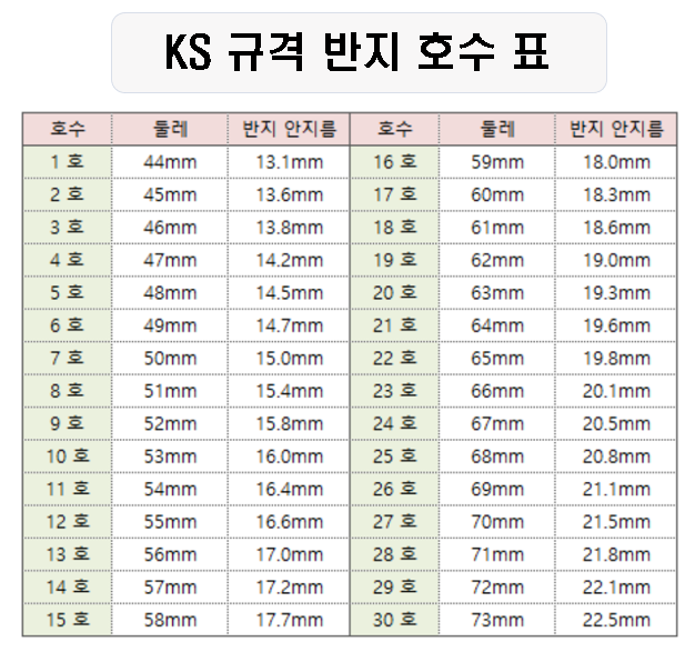 그리고 이 지름에 맞는 반지 호수를 아래 표를 이용해서 보시면 됩니다.