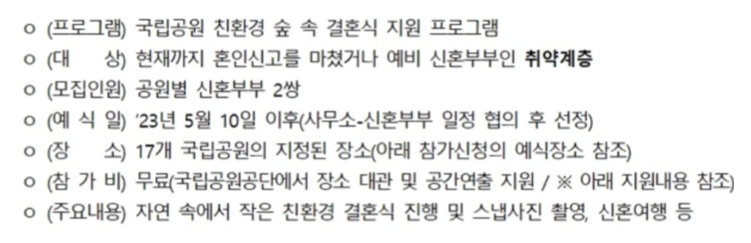 환경부 산하 국립공원공단(이사장 송형근)은 취약계층에게 '일회용품 없는 친환경 결혼식'을 무상으로 지원하기 위해 2023년 3월 27일부터 4월 20일까지 참여자를 모집한다고 밝혔습니다.