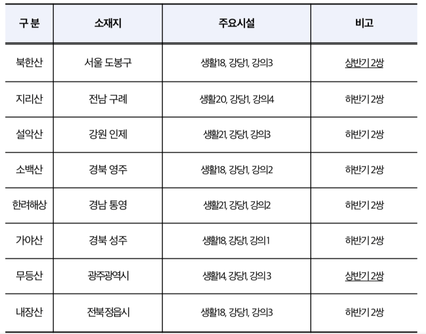 지리산 / 전남 구례 / 생활20, 강당1, 강의4 / 하반기 2쌍
