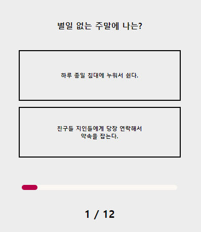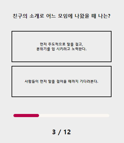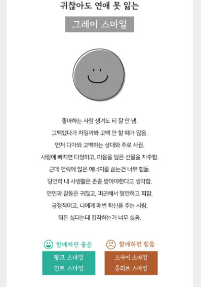 저의 테스트 결과는 그레이 스마일입니다 결과를 보자면 좋아하는 사람 생겨도 티 잘 안 내고 고백했다가 차일까 봐 고백 안 할 때가 많다 먼저 다가와 고백하는 상대와 주로 사귀고 사랑에 빠지면 다정하고 마음을 담은 선물을 자주 한다 근데 연락에 많은 에저지를 쏟는 건 너무 힘듦 당연히 내 사생활은 존중받아야 한다고 생각한다 등이 있었습니다
