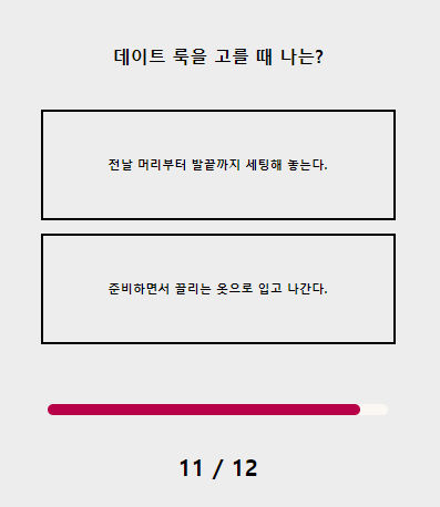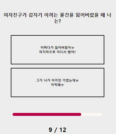 총 12가지의 문제들을 모두 풀게 되면 테스트 결과를 확인할 수 있습니다 다양한 문제들과 테스트 결과가 존재하기 때문에 재미있게 즐기시면 될것 같습니다.