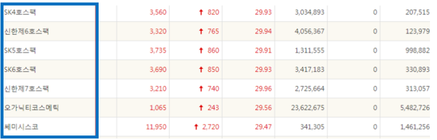 국내 상장된 스팩주들로는 예로 SK6호스팩, 신영스팩6호, 삼성스팩2호, 삼성스팩4호, SK4호스팩, 에이치엠씨제5호스팩, 하나머스트7호스팩, SK5호스팩 등등 많은 스팩주들이 많습니다.