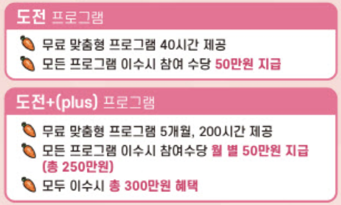 운영과정은 ‘도전’ 프로그램(5주 과정)과 ‘도전+(플러스)’ 프로그램(5개월 과정)으로 진행되며, 프로그램 이수시 50만원에서 최대 300만원까지(월별 참여수당 지급) 참여수당과 인센티브를 지원합니다.