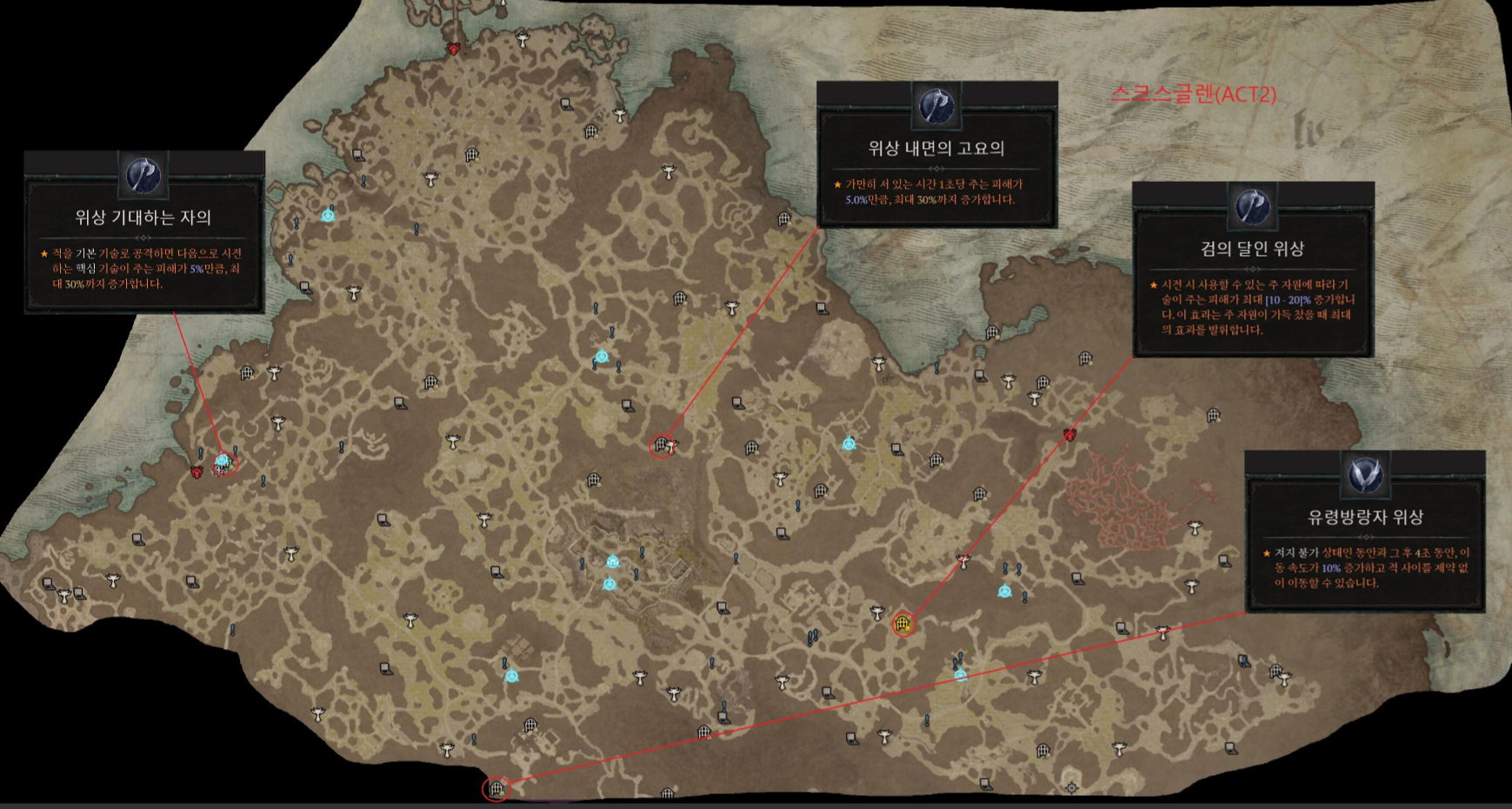 | 스코스글렌(ACT2) | 네크 | 불어나는 저주 | 뼈 영혼이 주는 피해가 이동 거리에 따라 증가하여 최대 00% 까지 증가합니다. |