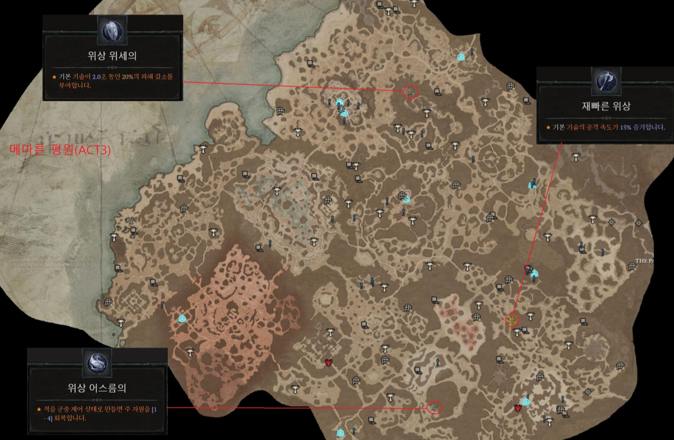 | 메마른평원(ACT3) | 공통 | 위세 | 기본 기술이 00초 동안 00%의 피해 감소를 부여합니다. |