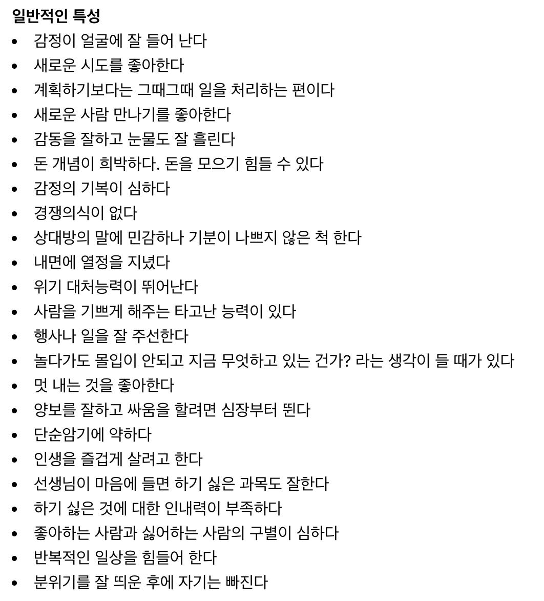 이번에 소개해 드릴 성격유형검사는 Myers, Briggs, von Franz 및 van der Hoop이 개발한 Jung 의 분류체계에 따라 독자 개발한 성격 테스트이며 공식 MBTI 테스트 (the Myers-Briggs Type Indicator® MBTI) 및 기타 이러한 검사 도구와 동일하지 않으므로 혼동하지 마시길 바랍니다. 해당 검사는 본 사이트에서 자체 개발한 무료 검사이며 16가지 성격유형의 분류와 각 검사 수치를 체계화하는데 있어서 높은 정확성을 보여줍니다. 각 문항마다 평소에 습관적으로 하는 것을 체크하시면 됩니다. 이 테스트는 테스트 바로가기를 클릭 후 진행해 주세요!