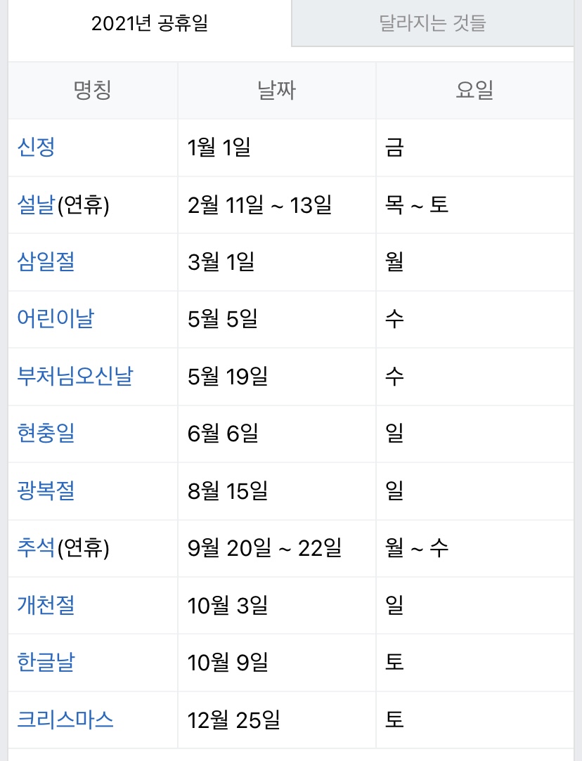 총 13일의 지정된 공휴일이 있고 이 중 주말에 공휴일날인 광복절, 개천절, 한글날, 크리스마스를 대체휴무일로 쉬는 것이 가능해 졌습니다.