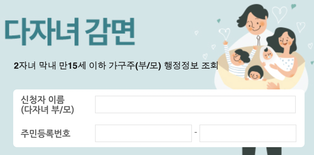 2. 다자녀가구 감면 등록(신청)은 행정정보공동이용센터를 통한 행정정보 조회 및 서류 심사를 통해 진행되며 위 입력 내용은 행정정보공동시스템과 연계하여 처리 하는 용도로만 이용되며 별도 수집되지 않습니다.