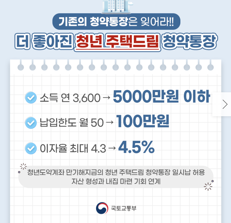 청년 주택드림 청약통장: 만 19~34세 무주택자를 대상으로 한 파격적인 청년 전용 청약통장으로, 가입 요건이 완화되고 이자율과 납입 한도가 현행 대비 높아져 자산 형성과 청약 기회를 제공합니다.