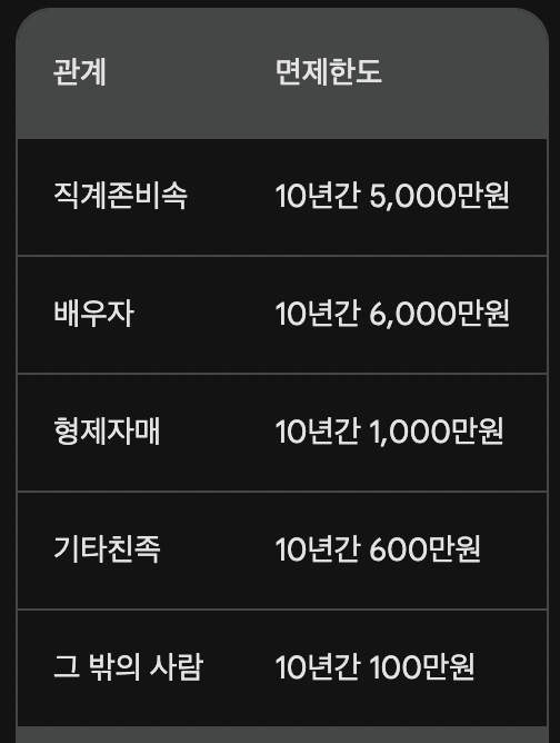 증여세 면제한도는 다음과 같습니다.
