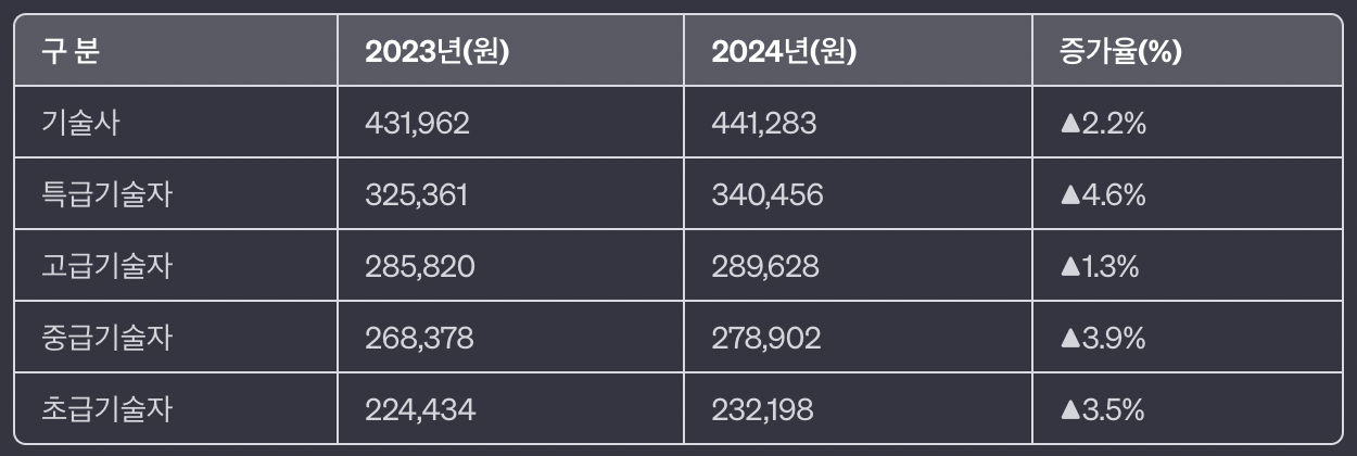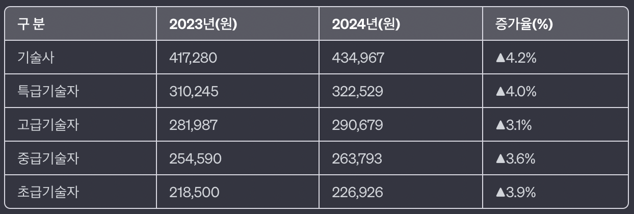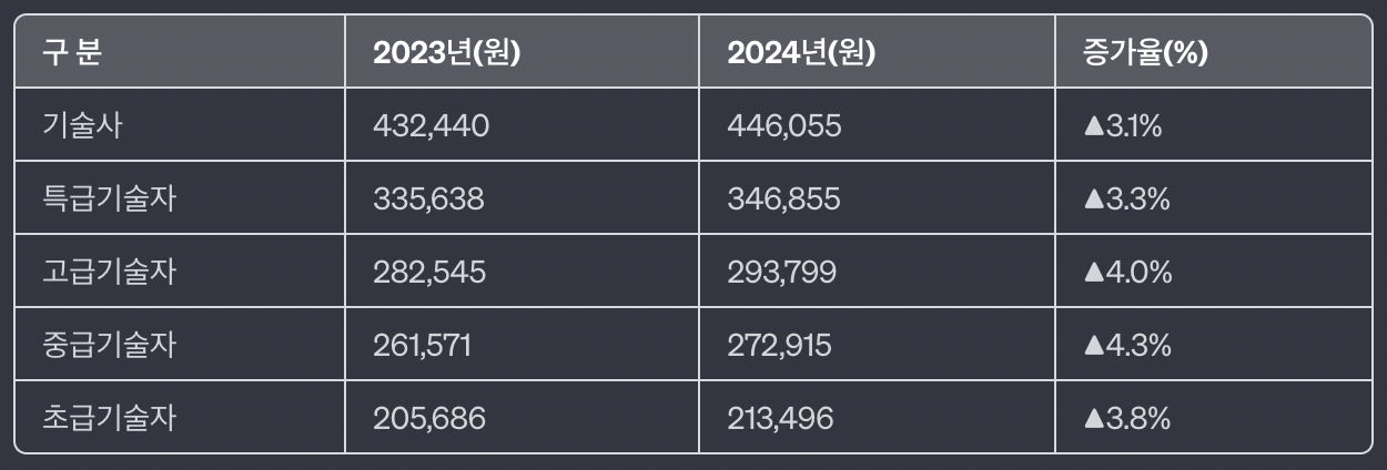 안녕하세요! 아래는 2024년 엔지니어링 기술자 노임단가와 증가율에 대한 정보입니다.