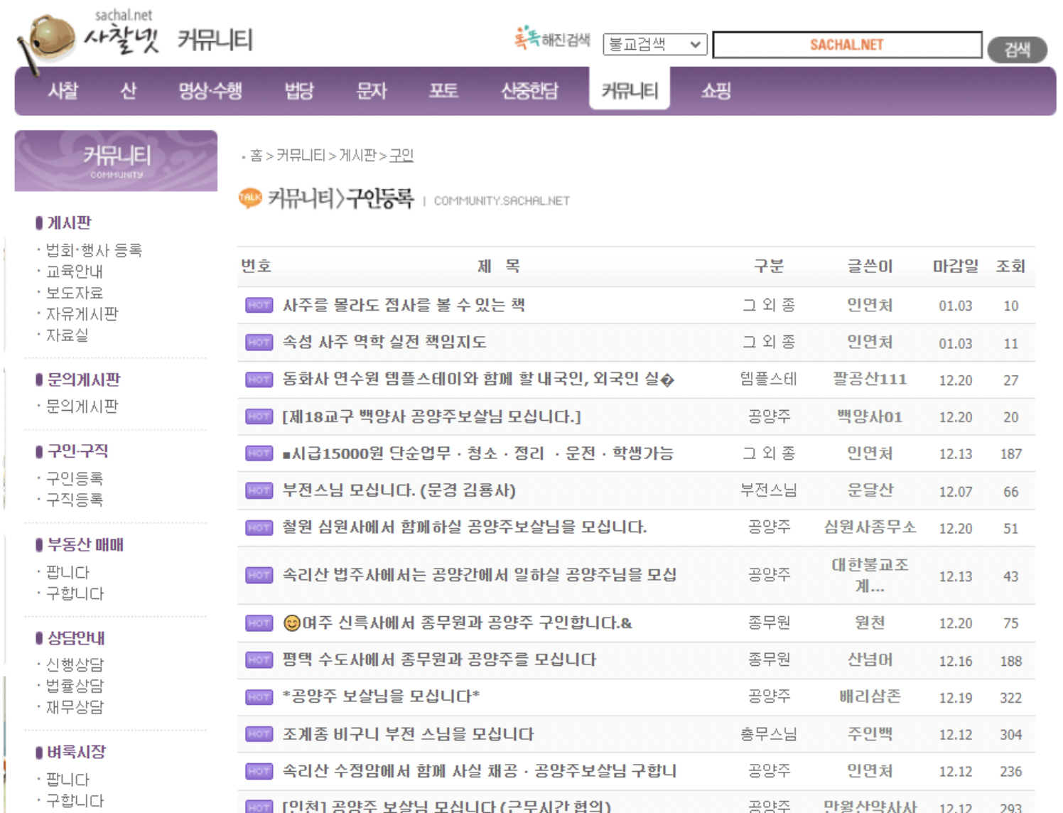 사찰넷 구인구직은 주로 불교계 종사자를 대상으로 하는 구인구직 사이트로, 사찰, 절, 템플스테이 등에서 일할 수 있는 다양한 정보를 제공합니다.