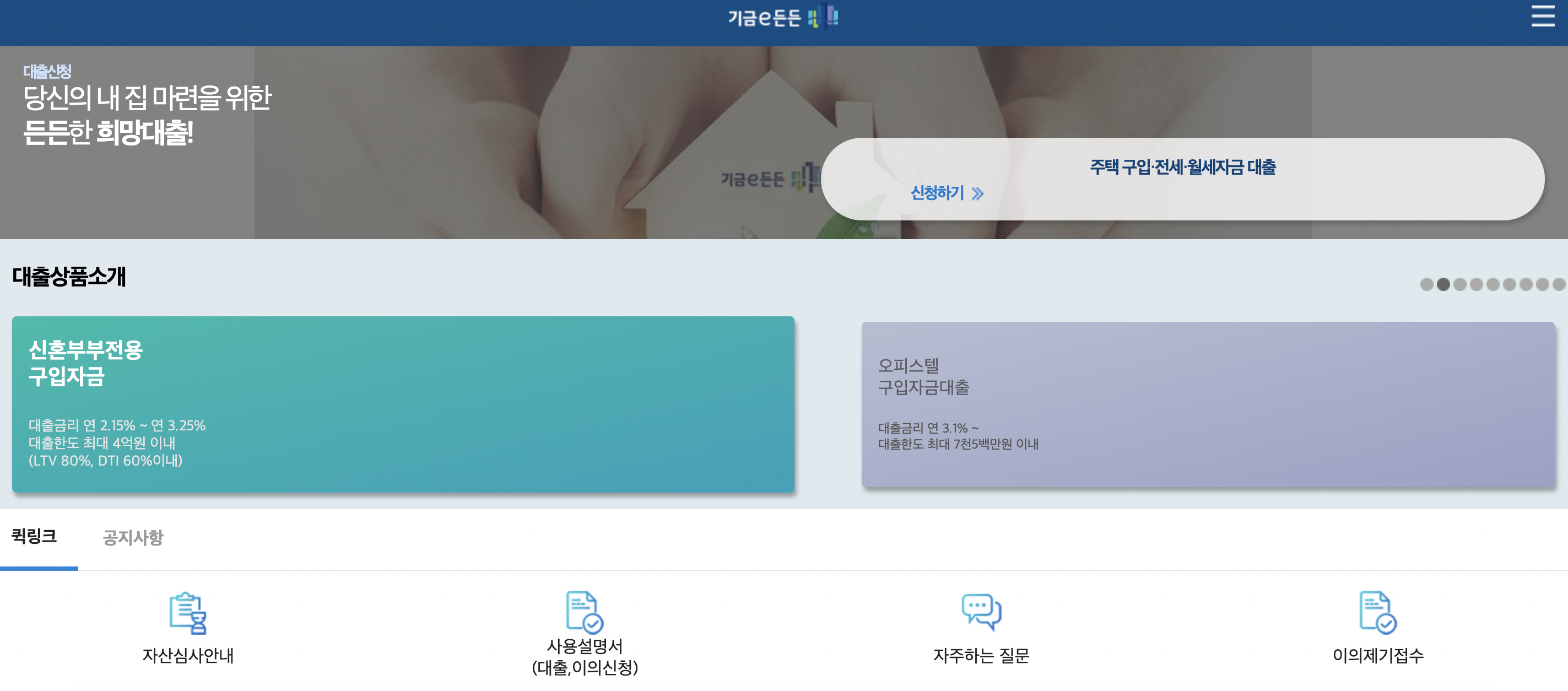 주택도시기금 대출상품소개, 대출신청, 대출신청현황 조회, 대출실행내역 조회, 소명자료 제출