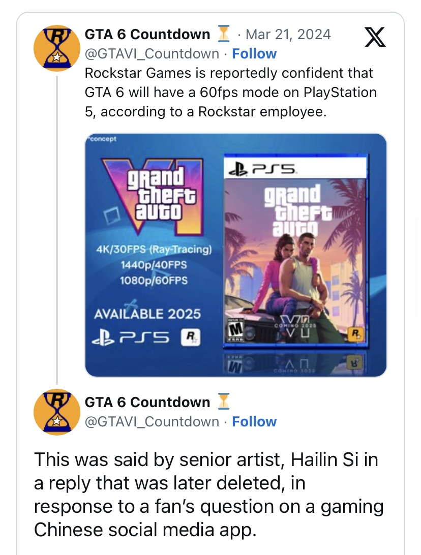 Rockstar 북의 시니어 아티스트, Hailin Si는 GTA 포럼에서 게임이 안정적인 60 FPS 모드를 갖게 될 것이냐는 질문에 대해 "나는 잘 모르겠지만, 우리는 자신 있어"라고 답변했다. 이 답변은 알려진 이유로 인해 삭제되었다. X (이전 트위터) 사용자인 @GTAVI_Countdown는 Si의 LinkedIn 프로필과 함께 게시된 삭제된 답변을 보여주는 게시물을 게시했다. 따라서 그의 롤은 확인되었다.