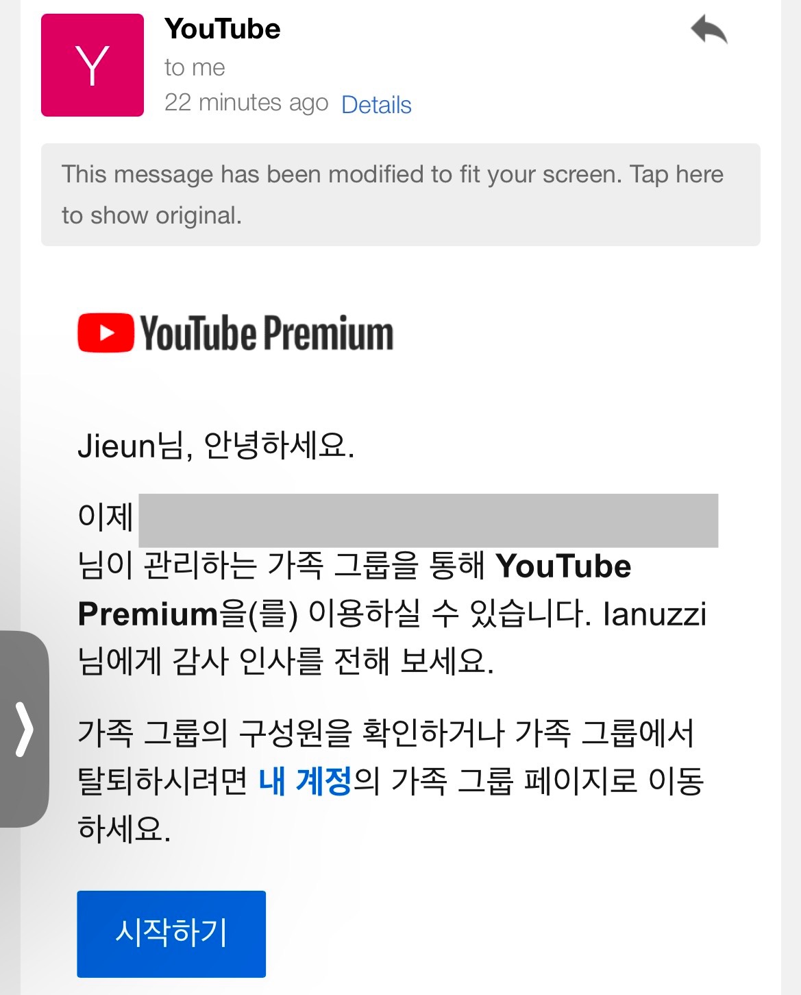 처리 완료 후에는 아래와 같은 초대 메일을 받게 되며, 초대를 수락하고 간단히 설정을 마치면 유튜브 프리미엄 이용이 가능합니다.