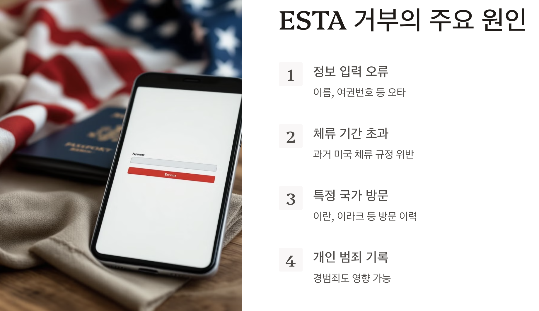 ESTA(전자 여행 허가) 신청이 거부되는 이유는 여러 가지가 있습니다. 단순한 실수부터 법적 문제까지 다양하죠. 주요 거부 사유를 알아두면 예방도 가능하고, 해결책도 빠르게 찾을 수 있습니다.