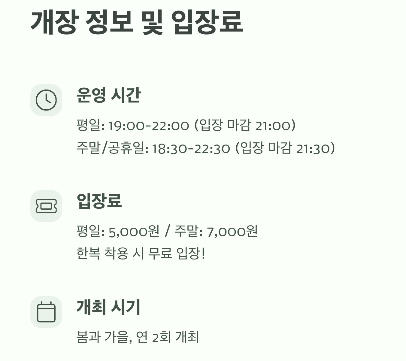 | 주말 및 공휴일 | 18:30 ~ 22:30 (입장 마감 21:30) | 7,000원 |