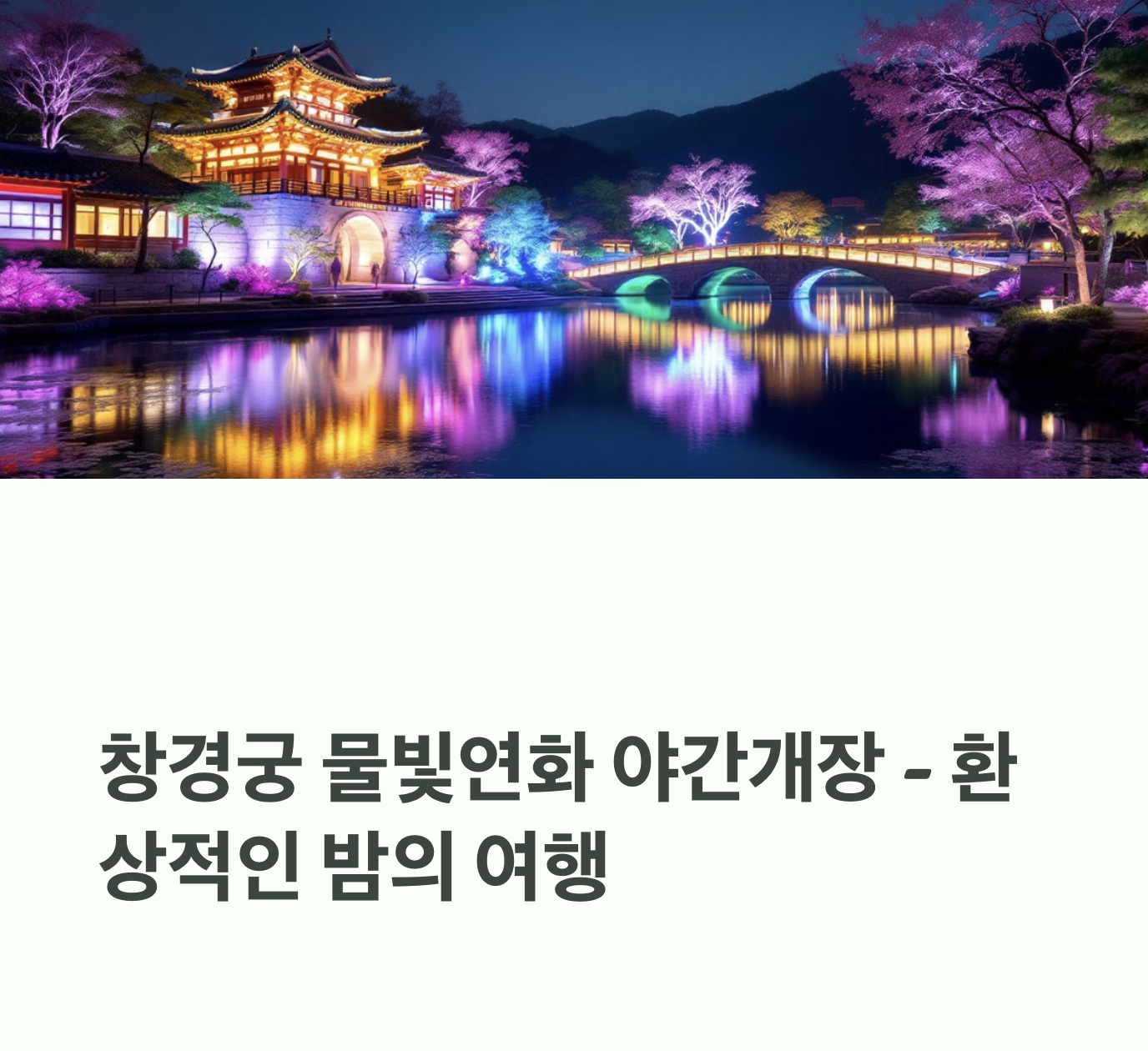 안녕하세요, 여행을 사랑하는 여러분! 오늘은 서울의 보석 같은 장소, 창경궁의 야간개장 프로그램인 '물빛연화'에 대해 소개해 드리려고 합니다. 저도 최근에 다녀왔는데, 그 경험을 여러분과 나누고 싶어요.
