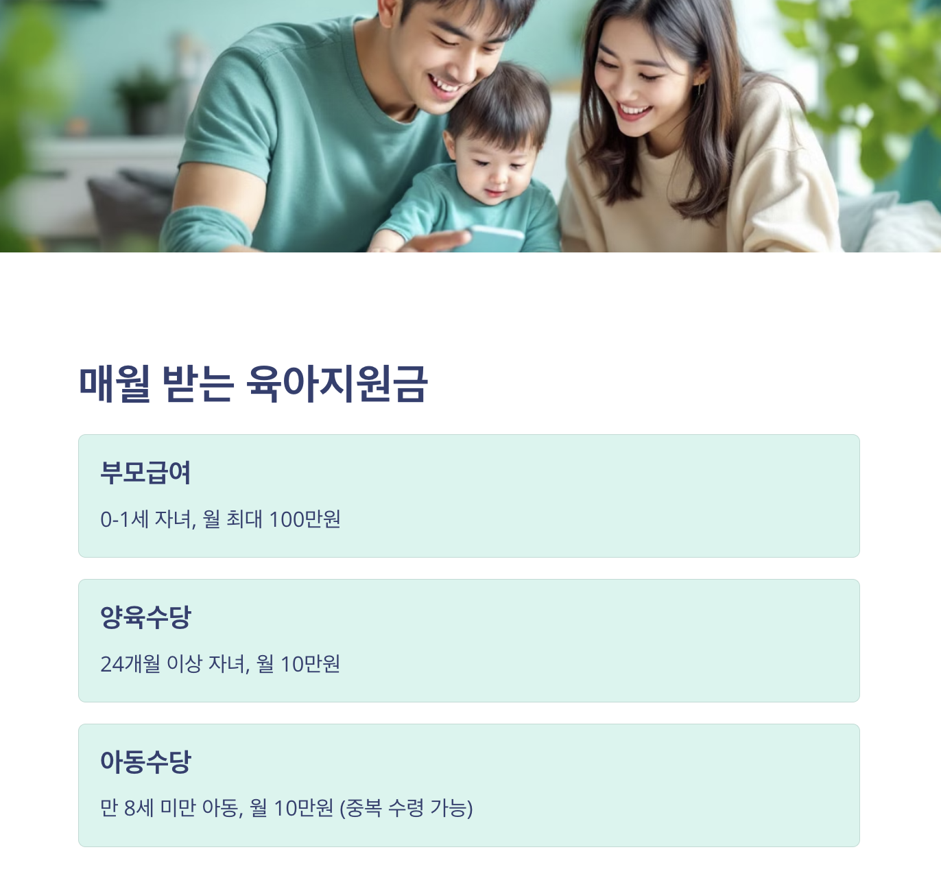 아동수당은 기본적으로 만 8세 미만의 모든 아동에게 지급되는 현금 혜택이에요. 이게 좋은 점은, 보육기관을 다니든 안 다니든 상관없이 무조건 나온다는 거죠. 더불어 부모급여나 양육수당과도 중복 가능하다는 게 포인트!