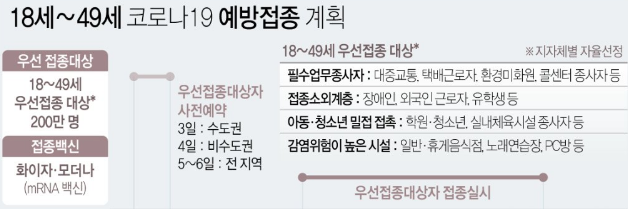 우선 18∼49세 가운데 택배 근로자, 환경미화원 등 각 지방자치단체가 우선 접종이 필요하다고 판단한 약 200만명은 3일 오후 8시부터 접종 일정을 예약가능