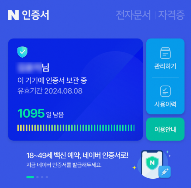 이 후 다시 네이버 인증서 화면으로 접속해 보면 본인의 간편인증서가 발급되었음을 확인할 수 있습니다.