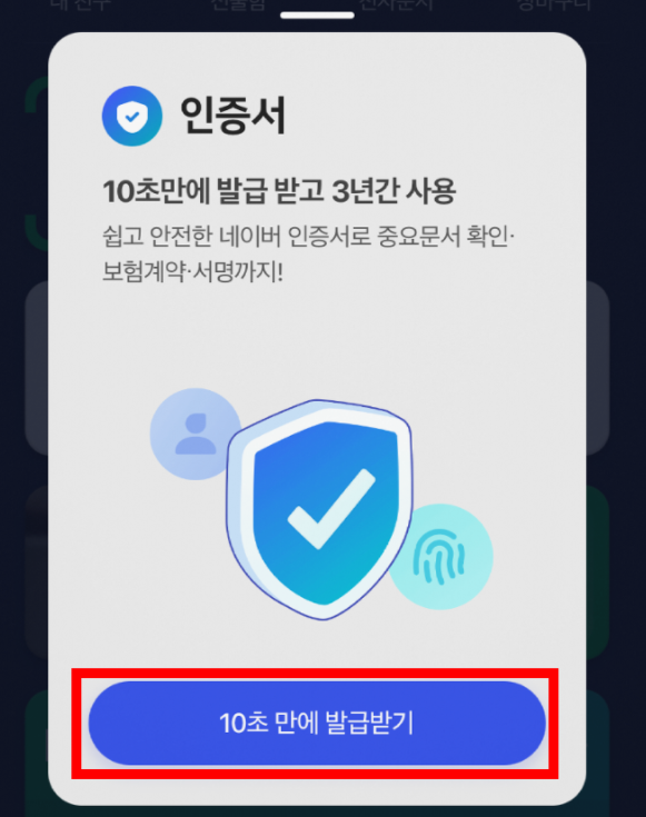 화면에서 '인증서 안심 발급받기'를 찾아 누르고, 그 다음에 뜨는 팝업에서 '10초 만에 발급받기'를 누릅니다.