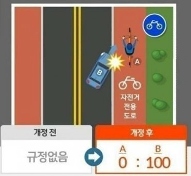 자전거 전용도로를 주행중인 자전거 A가 차로에서 자전거 도로로 진입한 B차량과 사고가 날 경우 기준이 새롭게 추가되어 B차량 과실 100%로 처리됩니다.