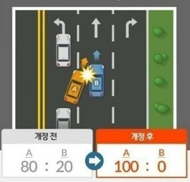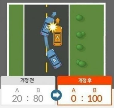 금융위원회·금융감독원·손해보험협회가 2019년 5월 27일 새 '자동차사고 과실비율 인정기준'을 마련, 5월 30일부터 시행한다고 발표했다. 이 개정 기준은 2019년 5월 30일 손해보험협회 분쟁심의위원회에 접수되는 사고부터 적용됐다.
