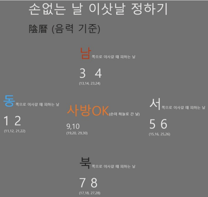 음력으로 이사가는 날과 방향을 알면, 이사가는 방향 동, 서, 남, 북에 적힌 날짜를 피하면 됩니다.