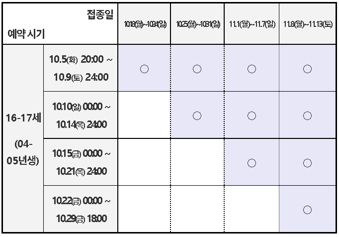 👉 12∼15세(2006∼2009년생)의 예약 및 접종일정은 약 2주 뒤로, 사전예약은 10월 18일(월) 20시부터 11월 12일(금)까지, 접종은 11월 1일(월)부터 27일(토)까지 실시