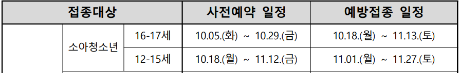 👉 12∼15세(2006∼2009년생)의 예약 및 접종일정은 약 2주 뒤로, 사전예약은 10월 18일(월) 20시부터 11월 12일(금)까지, 접종은 11월 1일(월)부터 27일(토)까지 실시