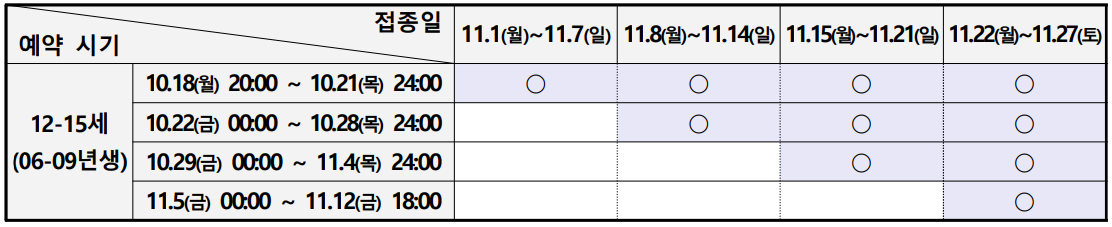 * 12∼15세(2006∼2009년생)의 예약 및 접종일정은 약 2주 뒤로, 사전예약은 10월 18일(월) 20시부터 11월 12일(금)까지, 접종은 11월 1일(월)부터 27일(토)까지 실시