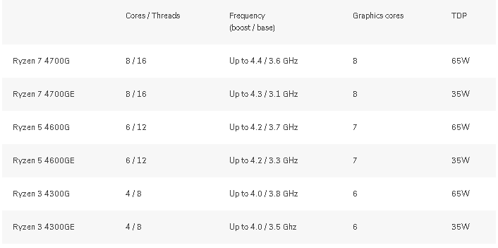 아래 전체 Ryzen 4000 G-Series 제품군을 볼 수 있으며, TDP 및 주파수 튜닝 면에서 근본적으로 다른 'GE' 모델도 확인할 수 있습니다.